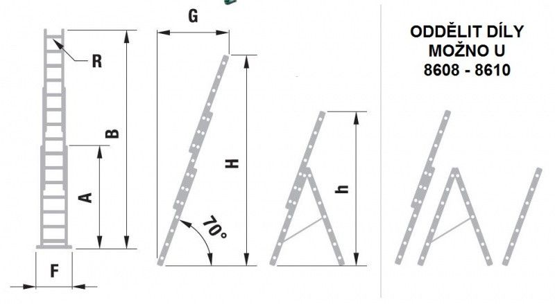 Rebrík výsuvný s troma dielmi,pričom tretí z nich zostáva spojený s telom rebríka a nedá sa použiť samostatne.Možno ho vysunúť do výšky aj oprieť o jeden diel,pokiaľ vás pustí popruh medzi dielmi a postaviť sa na dva nohy rebríka naraz.