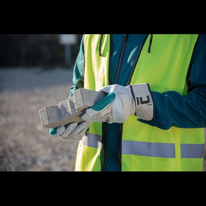 kombinované rukavicezdvojená dlaň zo šedej a zelenej hovädzej štiepenkychrbát a tuhá manžeta z bielej bavlnenej tkaninypodšívka v dlani