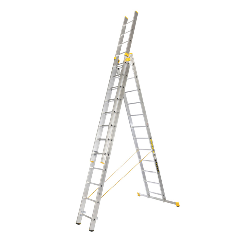 Trojdielny jednoduchý rebrík, čo znamená,že druhý diel sa môže z prvého vysúvať pri zloženom aj roztvorenom stave.Vďaka tretiemu dielu môžete rebrík prakticky oprieť,pokiaľ vás pustí popruh medzi dielmi rebríka a získať tak väčšiu stabilitu.