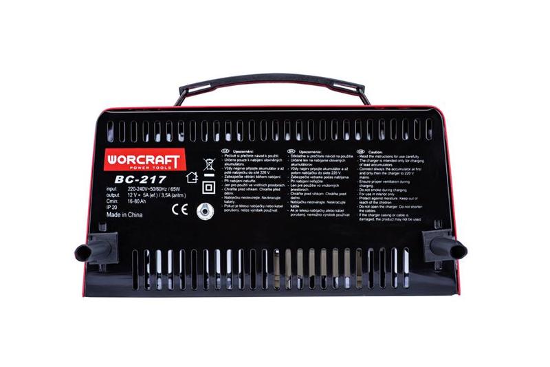 Nabíjačka Worcraft BC-217 je určená na nabíjanie olovených kyselinových akumulátorov s napätím 12 V. Vaša autobatéria bude nabitá rýchlo a spoľahlivo vďaka príkonu 65 W a nabíjaciemu prúdu 5/3,5 A. Nabíjačku stačí zapojiť do bežnej domácej elektrickej siete (230 V). Nabíjačka je vhodná na nabíjanie akumulátorov s kapacitou 16-80 Ah.