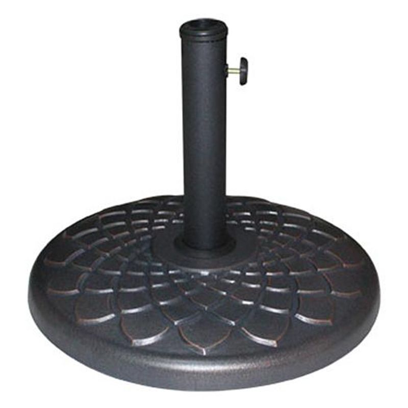 Stojan má kruhovú podstavu s priemerom 43 cm. Je vyrobený z trvácnej živice, čím sa nemusíte obávať o jeho životnosť. Vďaka svojej výraznej tmavej farbe a zaujímavej lupeňovej potlači bude nie len dekoratívny, ale tiež funkčný a praktický doplnok do každej záhrady. Slnečník sa napája do tyče vychádzajúcej zo stredu podstavy, dlhej 33 cm. Prekrytie častí stojanu a dážnika bude teda dostatočné nato, aby sa zabezpečila pevnosť celej konštrukcie. Priemer tyče dáždnika, ktorý sa nasadí do stojanu, môže byť maximálne 38 mm. Hmotnosť je až 25,66 kg, čo poskytuje bezpečný základ a stálosť.