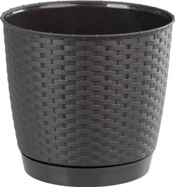 Okrúhly kvetináč s miskou svojou textúrou verne imituje prírodný ratanový výplet. Elegantný motív kvetináča možno využiť v interiéri aj v exteriéri. Dokonale sa hodí do letných záhradiek, kaviarní či reštaurácií.