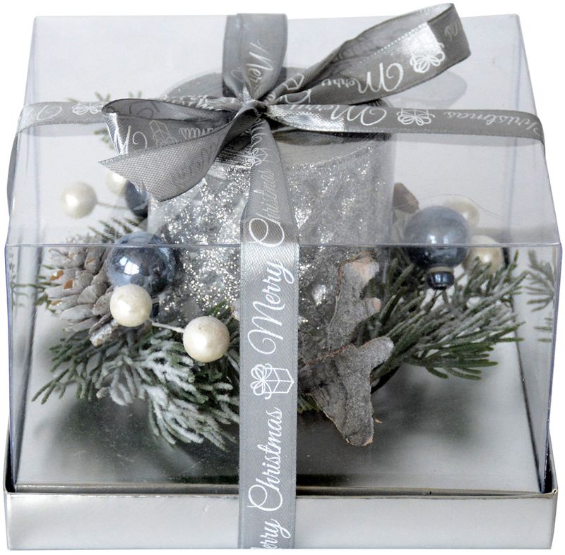 Svietnik MagicHome Vianoce, 15x15x10 cm, strieborná valcová sviečka, dekorácia s vetvičkami