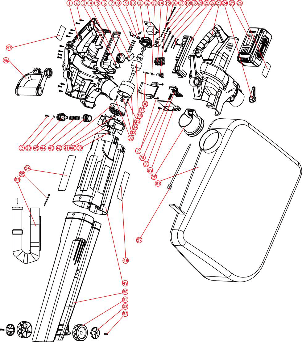 Fukár poskytuje prietok vzduchu 230 km/h a dosahuje maximálnu rýchlosť fúkania 8 m3/min. Pracuje rýchlosťou až 12000 otáčok/ min. Bežný čas nabíjania je cca 1 – 1,5 hodiny. Batéria je tepelnou poistkou chránená proti prebitiu, preto môže v nabíjačke zostať dlhší čas bez poškodenia (avšak, nie dlhšie ako 24 hodín). Na chod fukára sú potrebné 2 akumulátory. Akumulátory a nabíjačka nie sú súčasťou balenia!