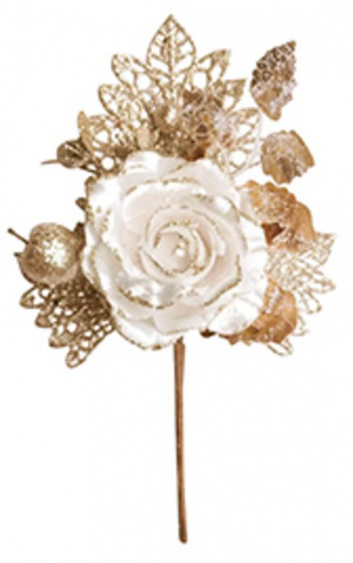 X Vetvička MagicHome Vianoce, s ružou, krémová, 25,5 cm, bal. 6 ks