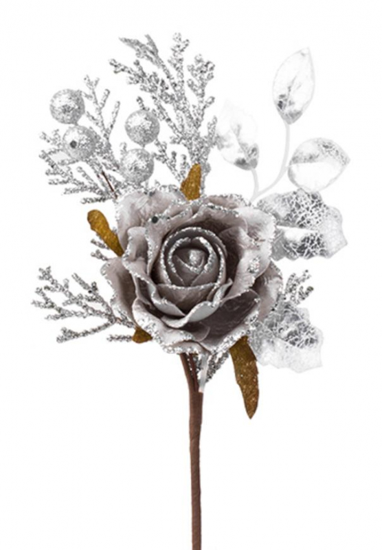 X Vetvička MagicHome Vianoce, s ružou, sivá, 26 cm, bal. 6 ks