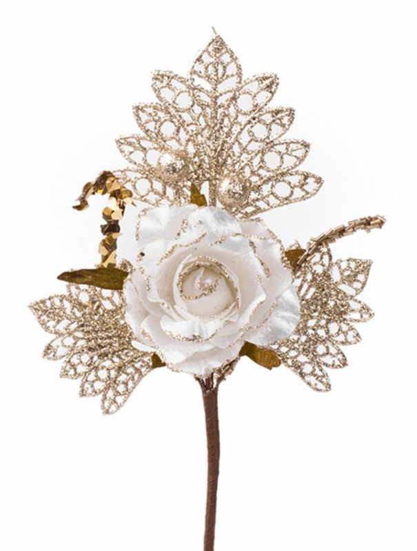 X Vetvička MagicHome Vianoce, s ružou, bielo - zlatá, 26 cm, bal. 6 ks