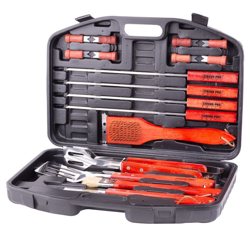 Sada obsahuje 18 nástrojov potrebných pre grilovanie. Vďaka kompaktnému baleniu nástrojov v praktickom kufríku je možné vziať ju so sebou kamkoľvek. V kufríku sa nachádzajú nástroje ako sú kliešte, obracačka, či škrabka na čistenie grilu. Funkčná plocha nástrojov je kovová, zvyšné časti pre potreby úchytu sú drevené.