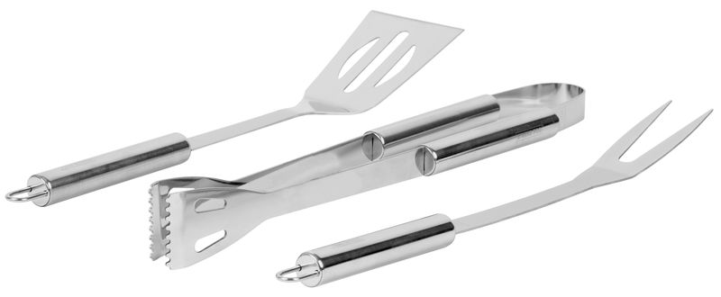 Sada na gril obsahuje tri kusy náradia - grilovaciu ihlicu, obracačku a grilovacie kliešte. Náradie je vyrobené z nehrdzavejúcej ocele, po použití sa ľahko umýva. Majú praktické očká na zavesenie. Táto sada ponúka základné vybavenie grilovacieho náradia.