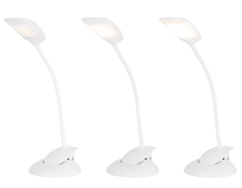 LED stolná lampička bude skvelým a funkčným doplnkom do každej izby či kancelárie. Obsahuje pripínací klip aj podstavec pre umiestnenie na stole, možno ju ohýbať podľa potreby. Súčasťou sú aj 3 vymeniteľné farebné kryty - čierna, zelená a biela. Je stmievateľná v 3 stupňoch jasu a má dotykové spínanie. Rozmer: 380x280 mm.