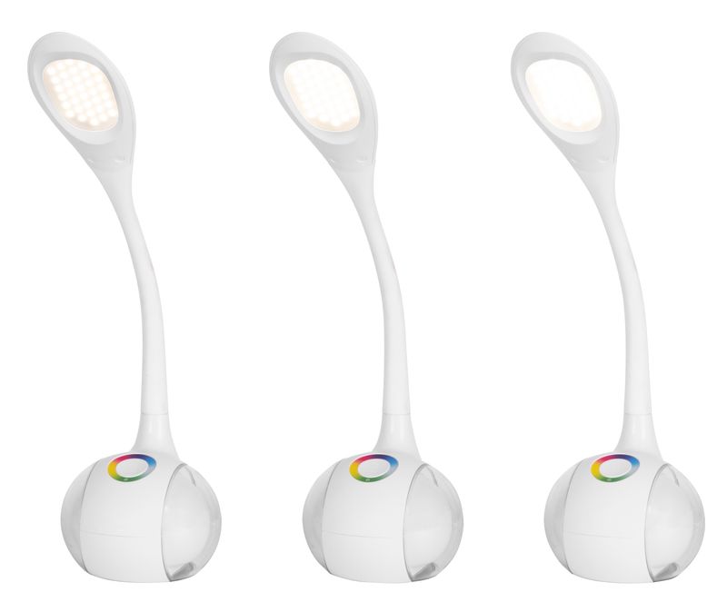 LED stolná lampička s atmosférickým podsvietením s až 256 farbami, z ktorých si môžete zvoliť ľubovoľnú farbu alebo režim automatického prelínania farieb. Lampa môže slúžiť aj ako nočné svetlo, je stmievateľná. Má dotykové spínanie, ohybné rameno a náklopnú hlavu. Farba: biely lesk. Rozmer: 540x160x130 mm.