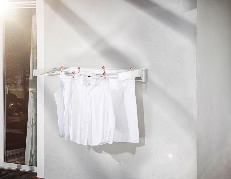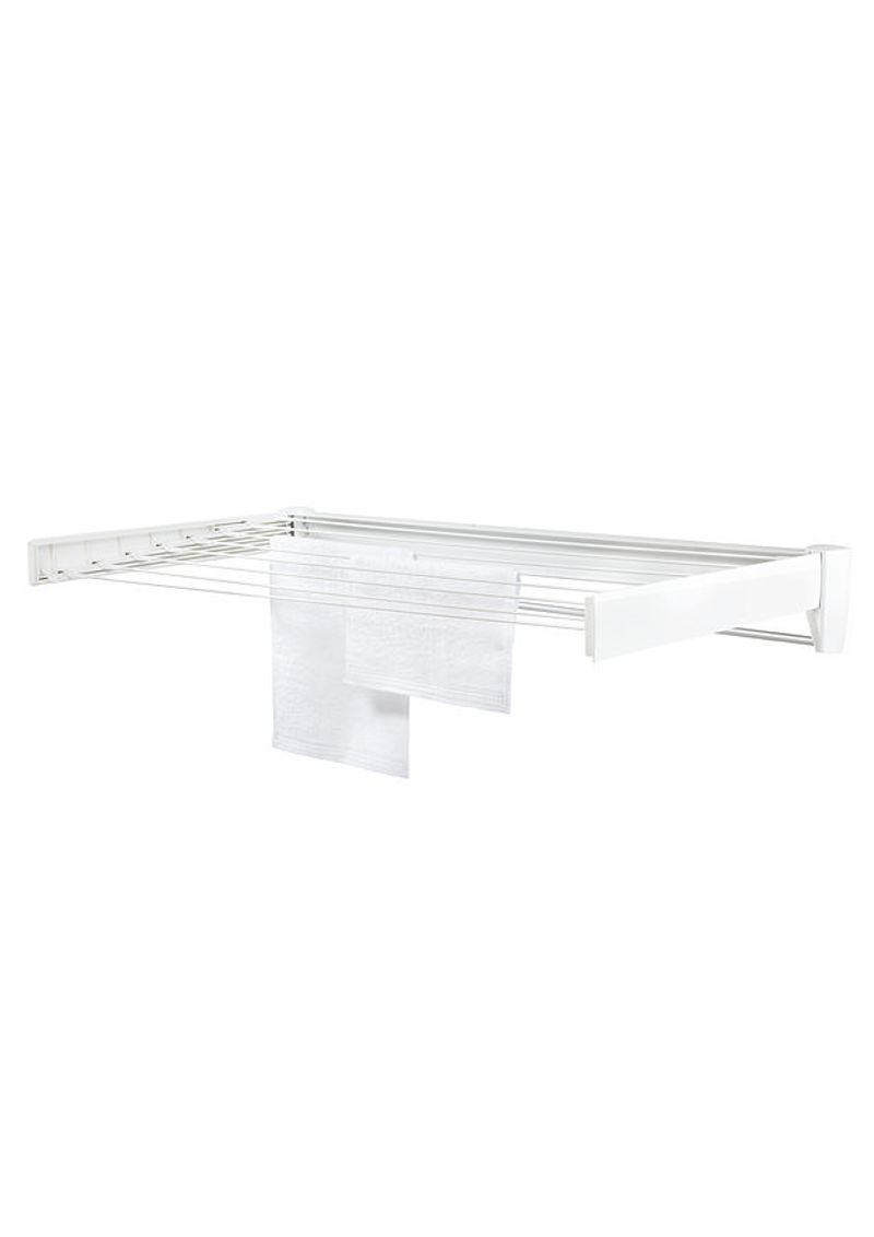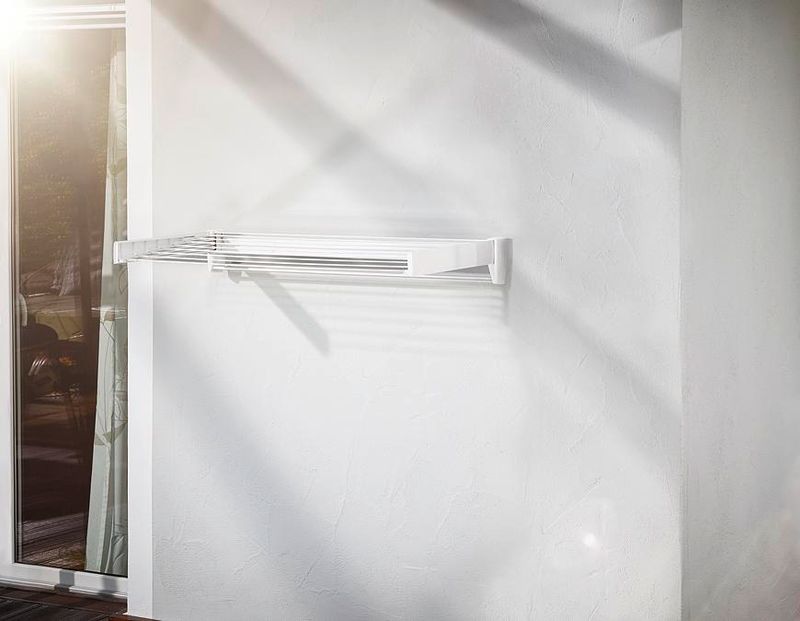 Praktický skladací nástenný sušiak na bielizeň, šetrí miesto, vhodný nielen do kúpeľne, samostatný chrómovaný vešiak na osušky, šírka tyčí 100 cm, 8,1 m sušiacej plochy = 1 práčka bielizne, záruka 3 roky.