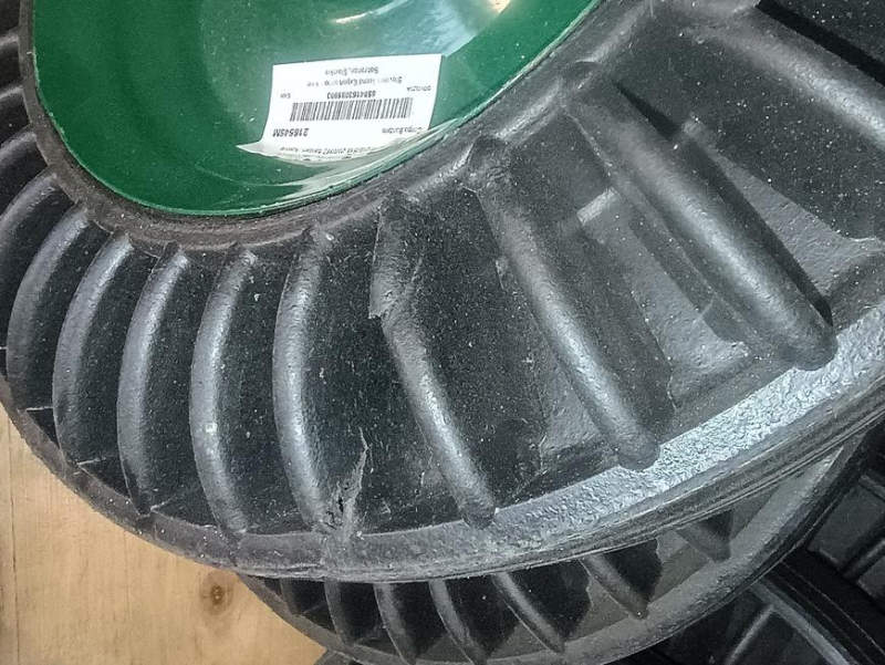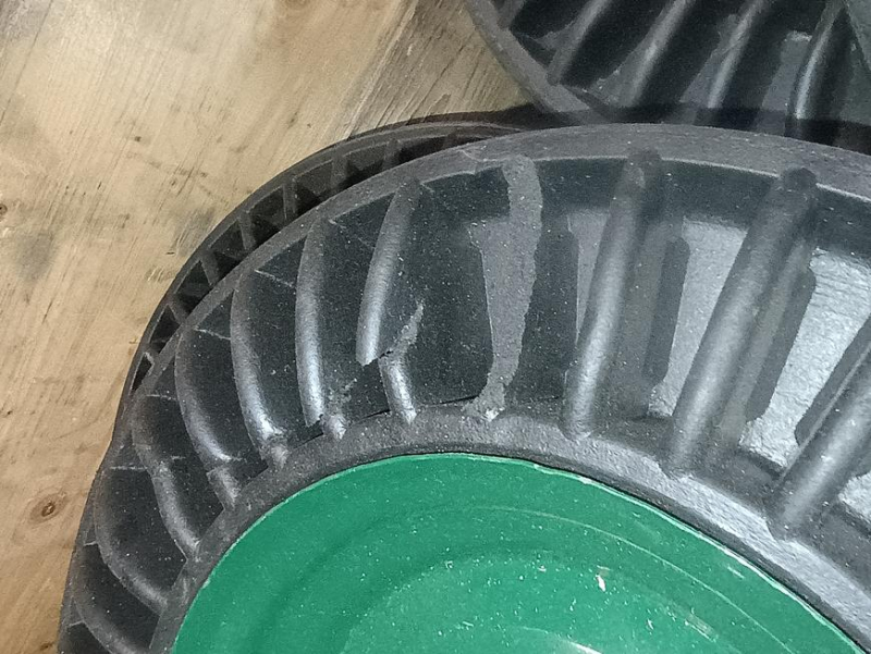 POPIS ZÁVADY: Poškodené rebrovanie na gumovej časti, začínajúca korózia, mierna deformácia po obvode kolesa.