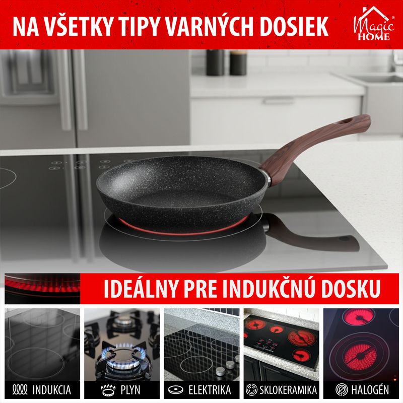 Ak si potrpíte nakvalitnékuchynské riady, táto panvica je pre Vás ako stvorená. Panvica MagicHome Black Marble Line jevyrobená zo zliatiny hliníka s nepriľnavým povrchoma3-vrstvovým mramorovým náterom. Má3 mm indukčné dno, ktoréšetrí energiu. Rukoväť obsahuje drevený náter s ochranou proti plameňu. Panvica jevhodná na všetky typy sporákov: indukcia, elektrika, plyn, sklokeramika a halogén a je tiež vhodná do umývačky riadu. Nevhodná do rúry. Ješetrná k životnému prostrediu, neobsahuje PFOA, PFOS, VOC, PB ani CD. Priemer: 28 cm.
