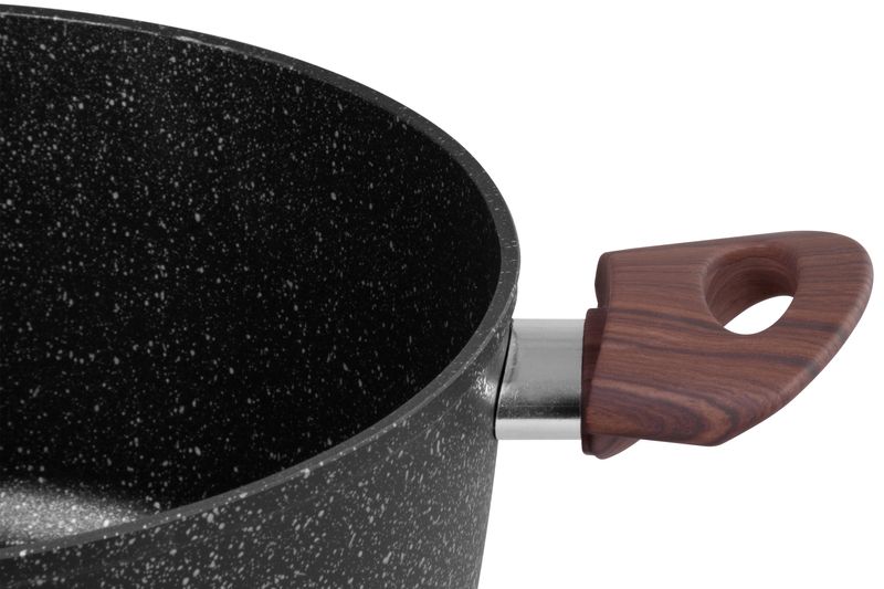 Ak si potrpíte nakvalitnékuchynské riady, tento hrniec je pre Vás ako stvorený. Hrniec s pokrievkou MagicHome Black Marble Line jevyrobený zo zliatiny hliníka s nepriľnavým povrchoma3-vrstvovým mramorovým náterom. Má3 mm indukčné dno, ktoréšetrí energiu. Rukoväť obsahuje drevený náter s ochranou proti plameňu. Hrniec jevhodný na všetky typy sporákov: indukcia, elektrika, plyn, sklokeramika a halogén a je tiež vhodný do umývačky riadu. Nevhodný do rúry. Ješetrný k životnému prostrediu, neobsahuje PFOA, PFOS, VOC, PB ani CD. Objem: 4 litre.