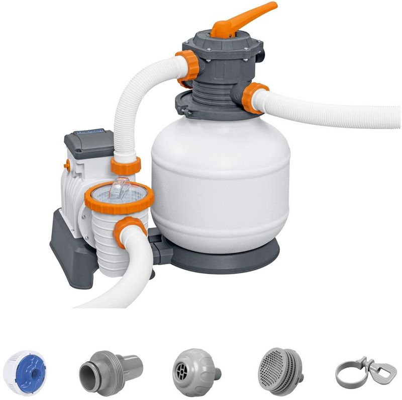 Filter je dodávaný aj s dávkovačom ChemConnect ™, ktorý udržuje čistú a zdravú vodu tým, že poskytuje stabilnú hladinu chlóru, ktorá je rovnomerne rozptýlená po celom bazéne. Tento produkt je dodávaný vopred zmontovaný a je kompatibilný s väčšinou 1 100 - 54 500 L nadzemnými bazénmi. Súčasťou balenia je adaptér pre bazénové ventily s vonkajším priemerom 3,8 cm. Piesok nie je súčasťou tohto filtra - požadovaná veľkosť piesku je # 20 kremičitý piesok, 0,45 - 0,85 mm, približne 20 Kg. Filter tiež skvele funguje s filtračnými guľami Bestway Polysphere ™.