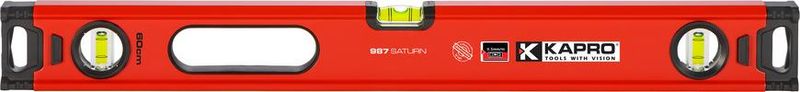 Vodováha KAPRO® 987X-41 Saturn je praktickým pomocníkom všetkých stavbárov a murárov, či domácich kutilov. Vodováha je vybavená tromi akrylovými libelami odolnými voči nárazom, veľkou výhodou pri tomto modeli je zväčšená horizontálna libela. Funkcia uchytenia na stenu. Na jej koncoch sa nachádzajú gumové hrany, ktoré vynikajúco tlmia nárazy. Presnosť vodováhy dosahuje 0,5 mm/m. Jej povrch je jemne frézovaný. Vodováha sa vyznačuje výbornou priľnavosťou na stenu. Dĺžka tejto vodováhy dosahuje 60 cm.