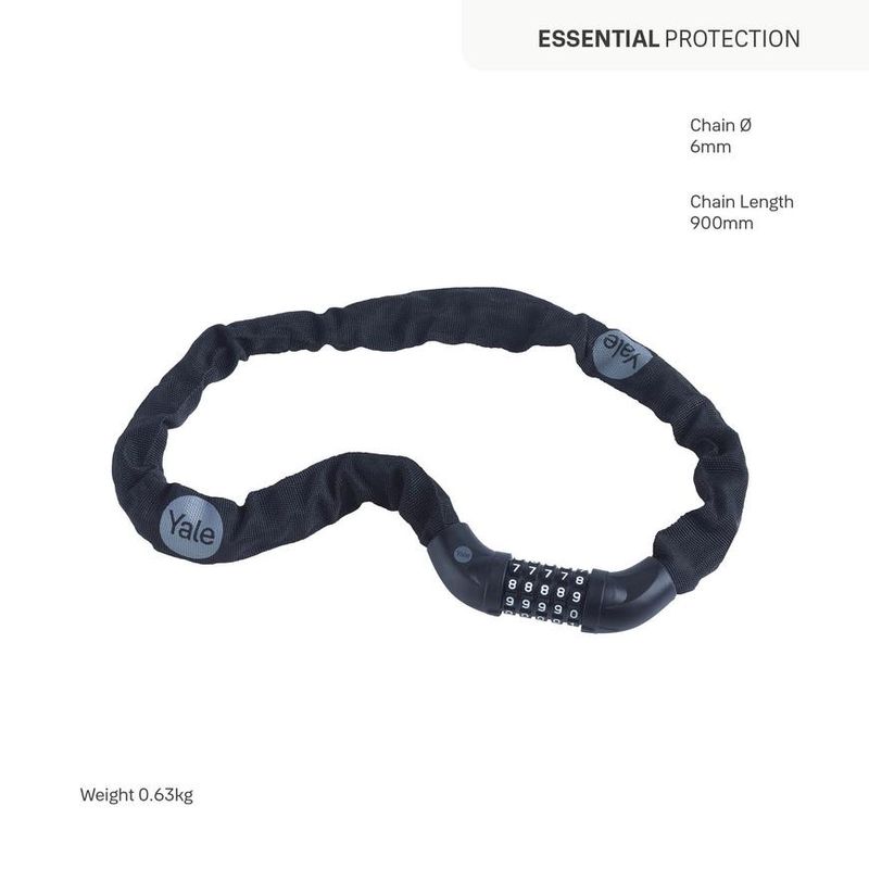 Reťazový zámok na bicykel Yale na kód. Reťaz vyrobená z uhlíkovej ocele. Odolný voči poveternostným vplyvom. Hrúbka reťaze: 6 mm. Dĺžka oceľovej reťaze: 90 cm.