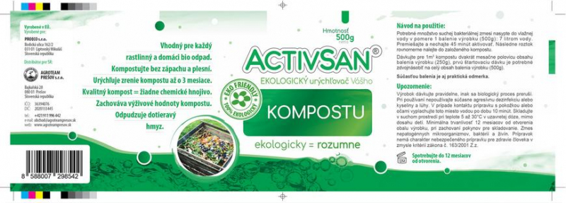 Úplne prírodný a ekologický bio-aktívny prípravok Activsan Kompost 500g urýchľovač kompostu je určený na urýchlenie kompostovania. Obvyklá dĺžka kompostovanie je v rozsahu jedného roka. Prípravok Activsan Kompost 500g vie značne urýchliť proces kompostovania záhradného odpadu a vybraného biologického odpadu z Vašej domácnosti. Activsan Kompost 500g je zmes bakteriálnych kultúr zmiešaných s nespracovanými enzýmami, emulgátormi a živinami, špeciálne navrhnutá pre kompostovanie organických odpadov (odpad po sezónnom prerezávaní okrasných kríkov - štiepka, kôra, piliny, tráva, lístie, ovocie, zelenina, kvety, bioodpad z domácností a pod.). Výrobok funguje v dvoch fázach: urýchlenie naštartovania a výrazné skrátenie celého procesu kompostovania. Použitím prípravku Activsan Kompost 500g dochádza k maximalizácii hnojív hodnôt kompostu. Výsledkom použitia prípravku Activsan Kompost 500g je skrátenie dĺžky kompostovania.