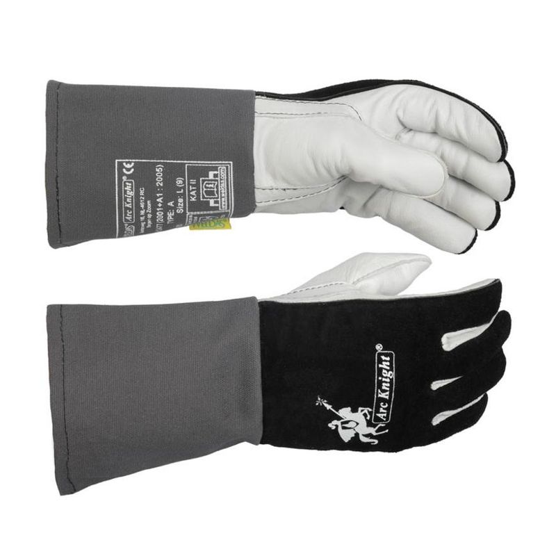 Zváracie rukavice Arc Knight® pre maximálmne pohodlie a použitie pre všetky typy zvárania. Čierna štiepaná a biela hrubá hovädzina.