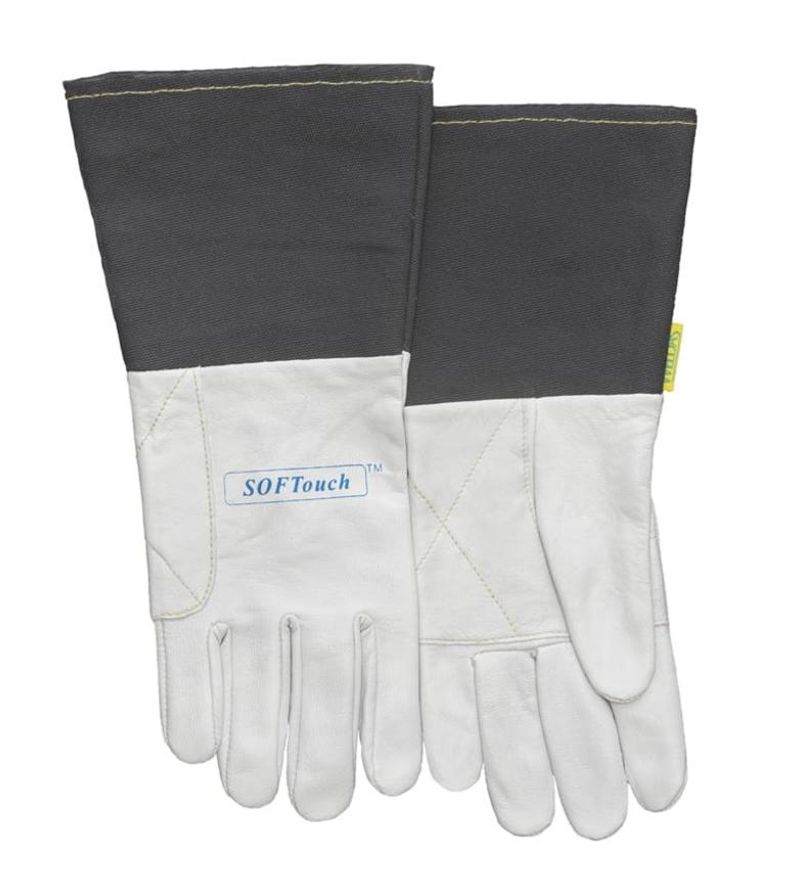 Jemné zváracie rukavice SOFTouch ™ z kozej lícovej kože, manžeta vyrobená zo šedej plameňu odolnej textílie.
