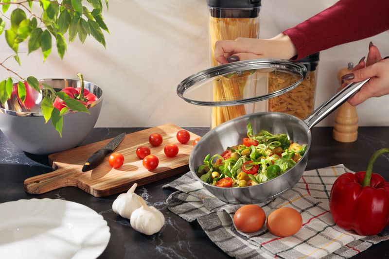 - Bezpečnosť a komfort: Pohodlná rukoväť zabezpečuje pevný úchop a jednoduchú manipuláciu aj pri vysokých teplotách.Sklenená pokrievkaumožňuje kontrolovať proces varenia bez potreby jej odklápania.