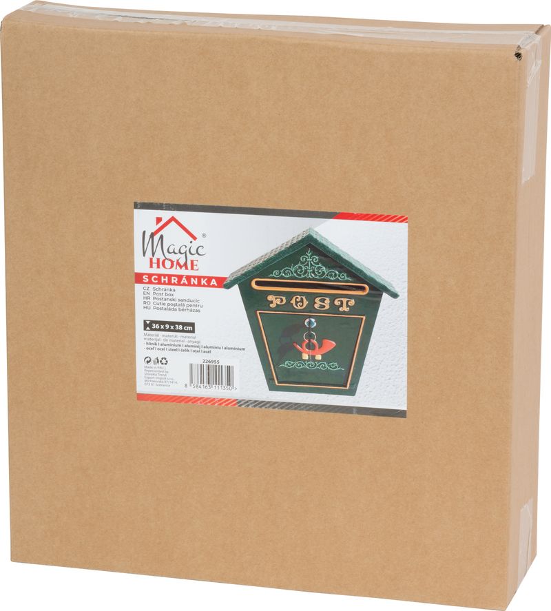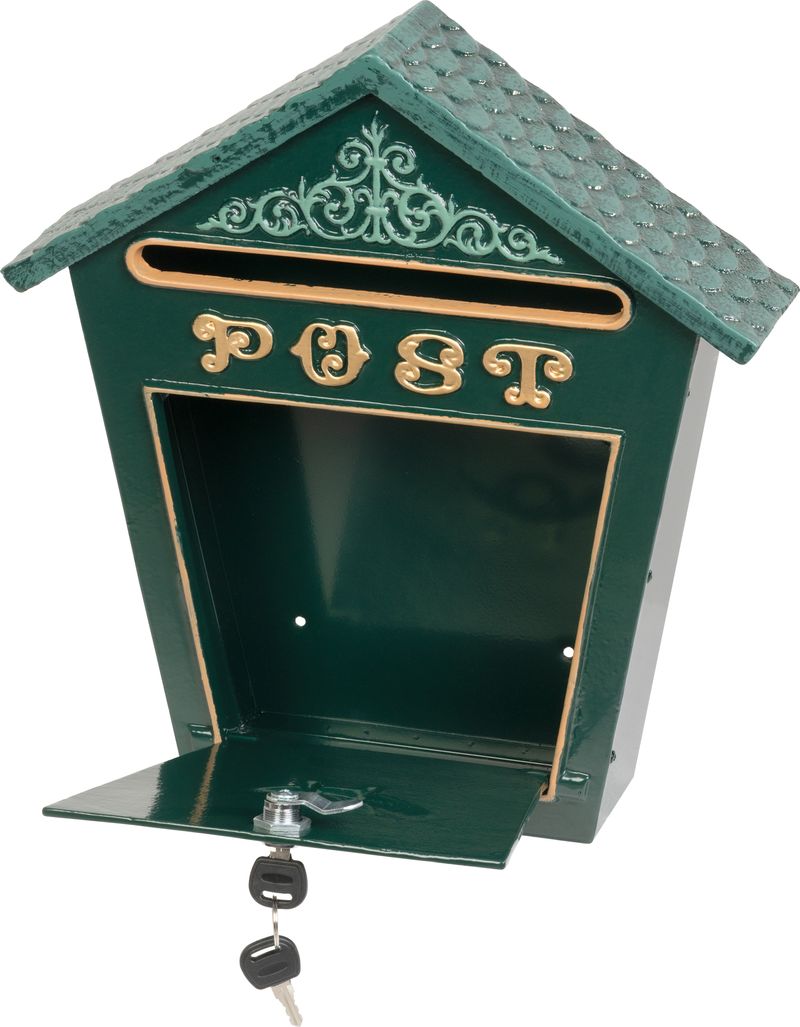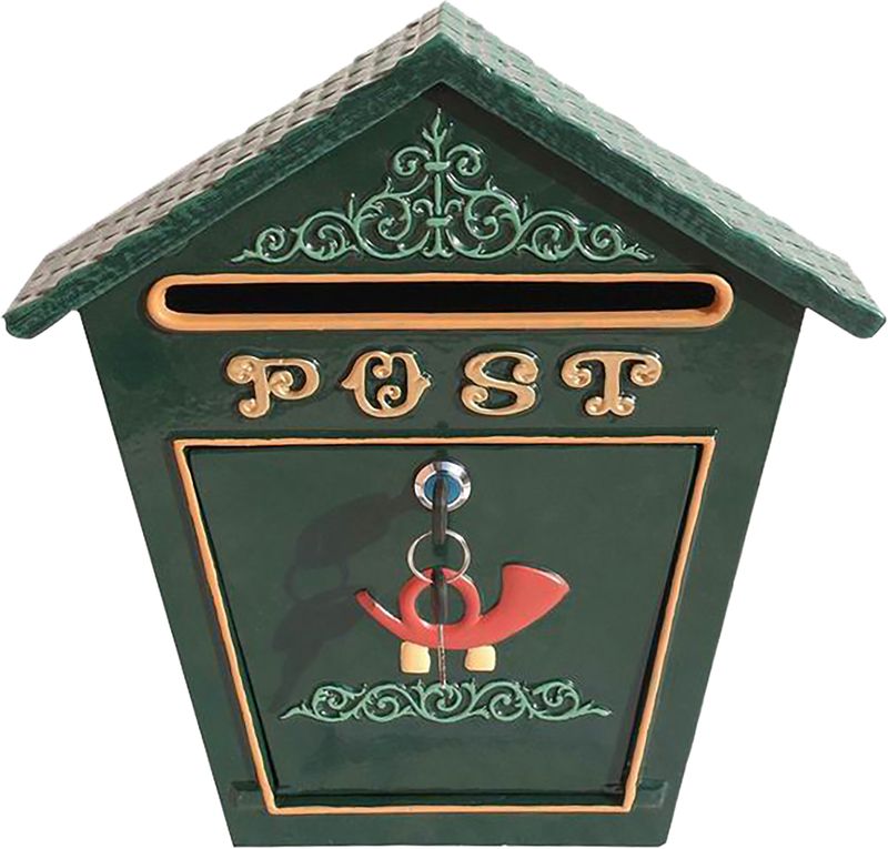 Poštová schránka Albert v elegantnej zelenej farbe je navrhnutá v tradičnom štýle s ozdobným reliéfom a výrazným nápisom POST. Vďaka svojmu tvaru so strieškou pôsobí dekoratívne a zároveň chráni poštu pred nepriaznivým počasím.