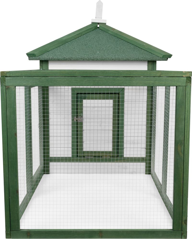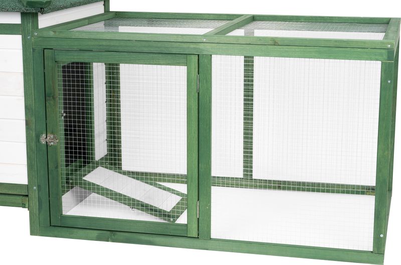 - Dvojdielna konštrukcia: uzavretý domček a priestranný výbeh s kovovou sieťou.