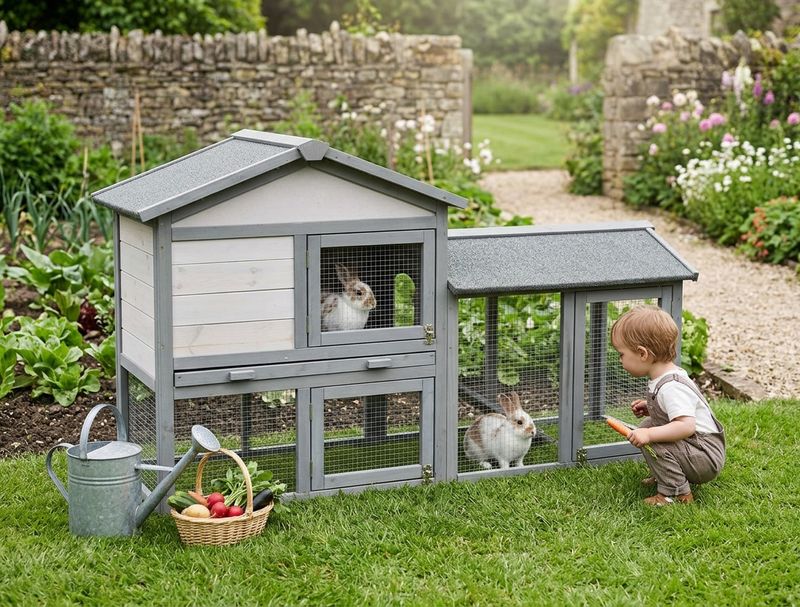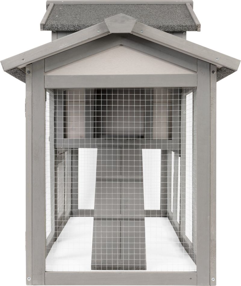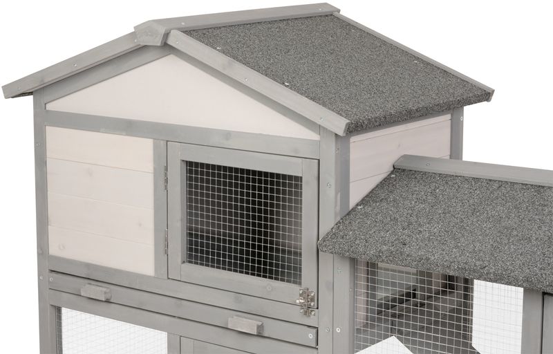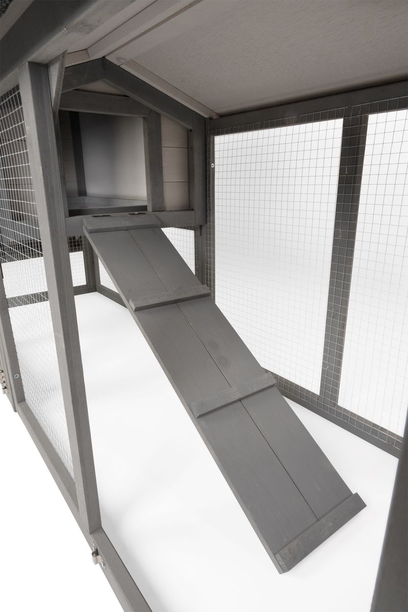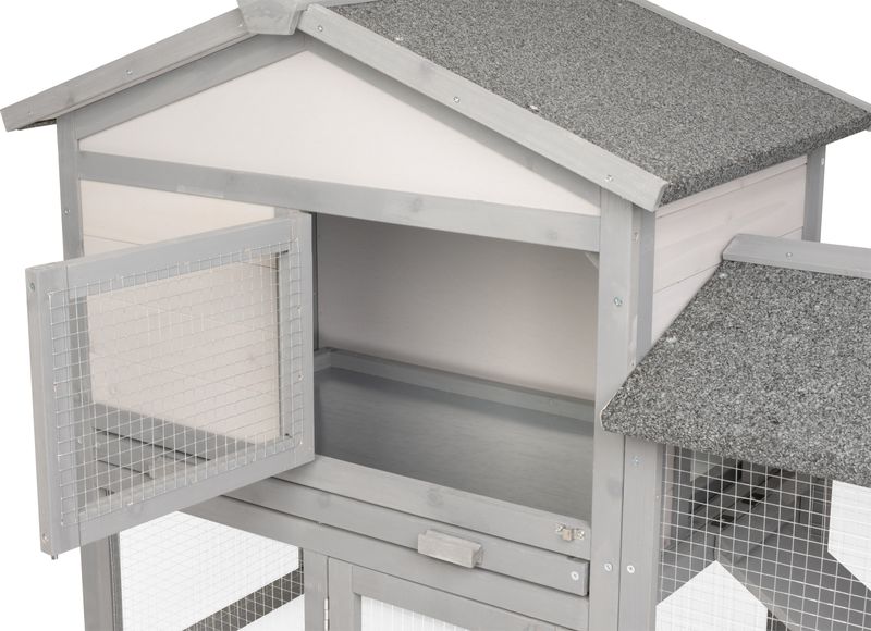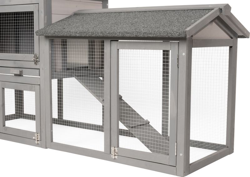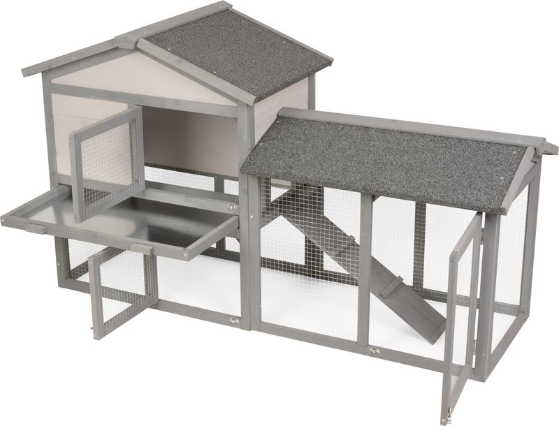 - Dvojdielna konštrukcia: uzavretá časť na spánok a úkryt + priestranný drôtený výbeh.