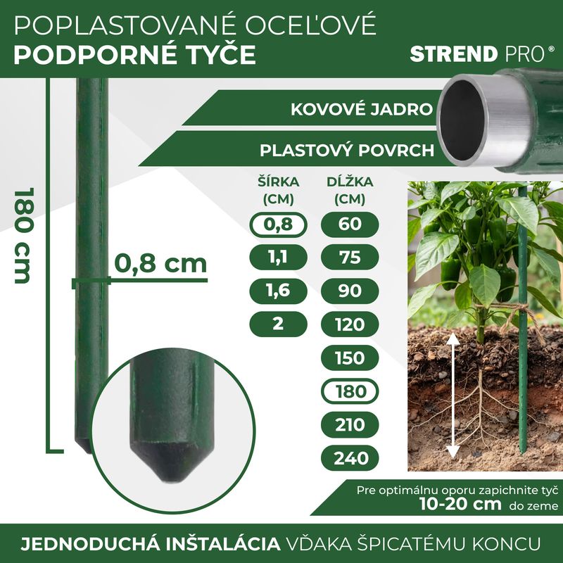 Zelená poplastovaná oceľová oporná tyč dĺžky 1 800 mm s priemerom 8 mm je vhodným doplnkom pre pestovateľov paradajok, ktorý chcú ochrániť ich pl... celý popis